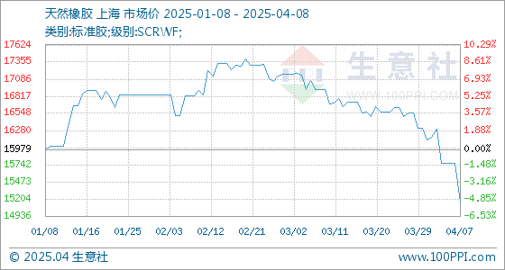 4月8日,生意社天然橡胶基准价为15160.00元/吨,与本月初(16138.00元/吨)相比,下降了-6.06%。