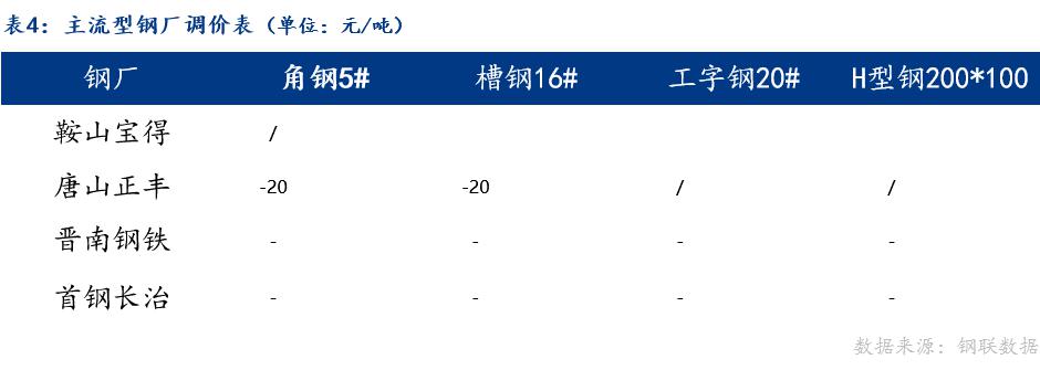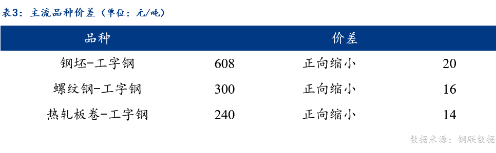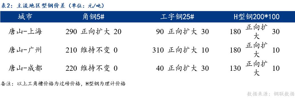 从区域价差来看,上海与唐山价差正向扩大;广州、成都字钢H型钢与唐山价差正向扩大。
