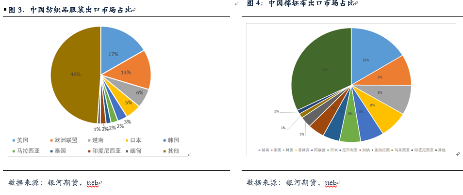 之前美国仅仅对中国的纺织品服装加关税的时候,中国的订单大量转移到其他国家,当然这其中也有许多中国的纺织品服装是通过转口贸易或者出口坯布再加工等方式从其他国家出口到欧美市场的。我们可以看到2024年我们的纺织服装出口市场除了美国、欧盟和日韩这几个大的消费市场外,大部分都出口到了越南、马来西亚、泰国、印尼以及缅甸等东南亚主要的服装出口国,这其中应该有一部分是通过第三国做转口贸易到欧美市场的。另外,我们也可以看到坯布市场的出口都是以南亚、东南亚等国家,这些国家通过进口中国棉坯布制造成服装然后出口到欧美市场。2024年我国出口到越南的棉坯布占比为16%,泰国占比9%,菲律宾占比8%,孟加拉国占比3%。本次美国对南亚、东南亚国家都加征高关税可以说是对中国及其周边的关联市场影响都比较大。一方面美国这次关税政策将中国能够出口到美国市场的各个渠道(转口或者再加工)都加了关税,另一方面由于对大部分国家都加关税,因此其他国家相对于中国的关税优势就下降了,特别是越南和柬埔寨由于美国对其加征大幅关税对其产业影响较大。