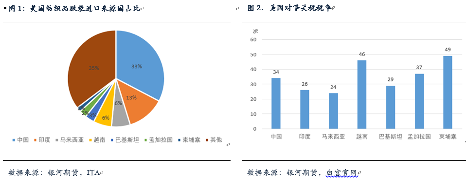 美国的纺织品服装大部分靠进口,而进口来源国主要是中国、南亚以及东南亚市场,其中从中国进口的纺服占比为33%,从印度进口占比为13%,从马来西亚进口占比为6%,从越南进口占比为6%,从巴基斯坦进口占比为3%,从孟加拉国进口占比为2%,从柬埔寨进口占比为2%,从这几个国家进口的纺织品服装占到美国纺服总进口额的65%。而这次美国对这几个国家的对等关税都比较高,其中最低的为马来西亚和印度分布为24%和26%,最高的为柬埔寨和越南分布为49%和46%。按照偏中间值的30%计算,既美国有65%的服装后面要加征30%的关税,因此美国国内的纺织品服装未来价格大概率会随着关税的提高而上涨,从而加剧美国国内的通胀。虽然美国政府希望通过这种途径来扶持其国内的制造业,但是纺织服装产业链很长,产业链不是短时间能够建立起来的,所以美国纺织品服装价格预计大概率会跟着关税的上涨而上涨。当然在美国对大部分南亚、东南亚市场都加征高额关税的情况下,其他纺服出口国家相对于中国的关税比较优势也减弱了,特别是越南、柬埔寨等市场。