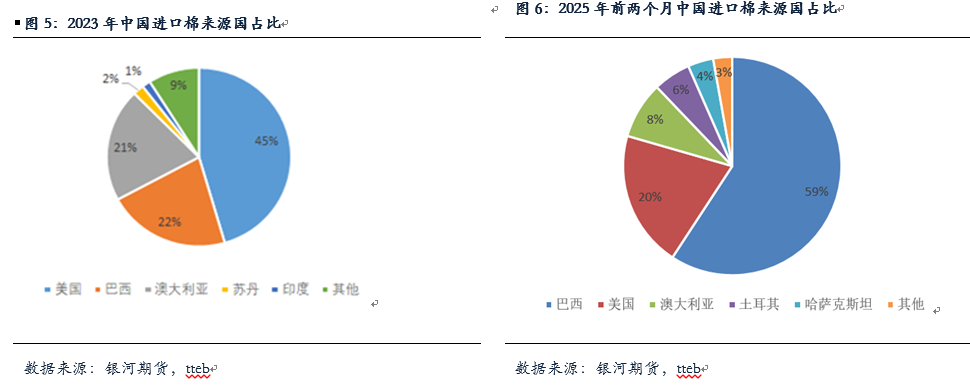 总结一下,首先,美国对中国加征高额关税并终止从中国内地和香港输美小额包裹的免税待遇对我国棉花消费有利空影响;其次美国对几个主要南亚、东南亚国家同时加征高额关税也利空其他纺织品服装出口国家,而越南等国家由于美国对其加征关税额较高,这些国家相对于中国的关税比较优势将下降;再次中国的反制措施对中国棉花供应影响不大但是对美国棉花出口影响较大,未来美棉的销售压力会进一步增加;最后从中长期来看,美国对全世界加征关税可能会加速美国的通胀,引起美国的经济衰退从而影响全球的经济及消费,也利空棉花消费。(观点仅供参考,不作为买卖依据)
