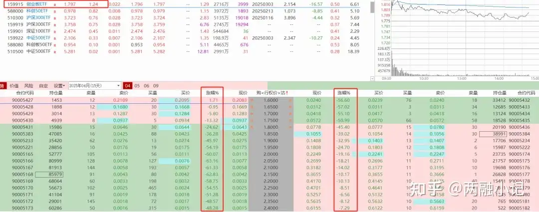 但是对于今天(2025年4月9日)的市场,创业板ETF上涨一个多点,但是对应的认购认沽期权都是下跌的,并且跌幅还不低。