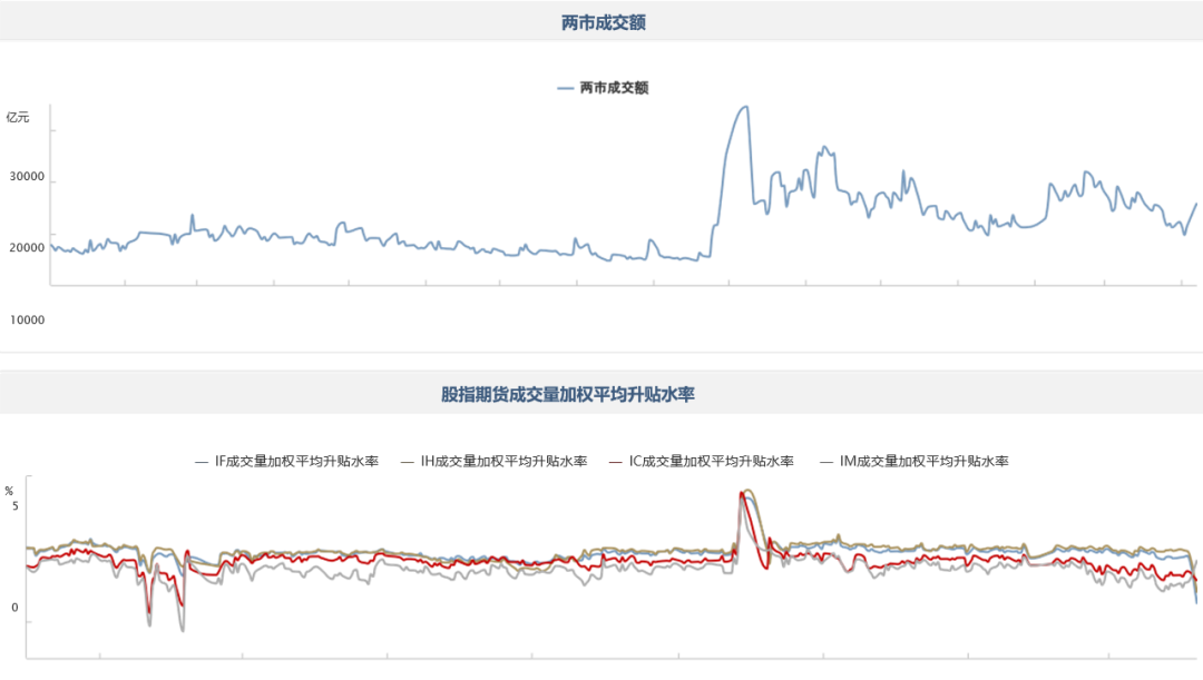 从市场指标来看短期避险情绪明显升温。现货层面,经历了近半个月的缩量,近两日两市成交额有所上涨,存在风险带来抛售的原因,同时,大幅下跌后,部分投资者尝试“抄底”以及国家队大举入场也推升两市成交额上行,周一仅华泰柏瑞沪深300ETF一只宽基,成交额即达到243亿元。但是下跌过程中量能扩大,按照以往的经验来看,放量下跌,一定程度意味着下行趋势将继续延续。期货层面,大小盘期指成交量加权平均升贴水走势涨跌不一,IF、IH、IC升贴水大幅下跌,逼近年初的超低水平,而IM升贴水明显上涨,主要源于期货10%跌停板,限制小盘期指跌幅,而中证1000指数现货跌幅达到11.39%。期指升贴水的大幅回落,反映市场当下交易了极度悲观的预期,后市若存在利好,或情绪面有所好转,股市将较快出现反弹。期权层面,隐波周一快速上行,不过从历史数据来看,当前水平并不高,相较924政策出台期间的前高水平,也仍有一定的距离,后续仍有上涨可能,而持仓量PCR快速下行,处于历史极低水平,也反映了资金交易较为悲观的预期。