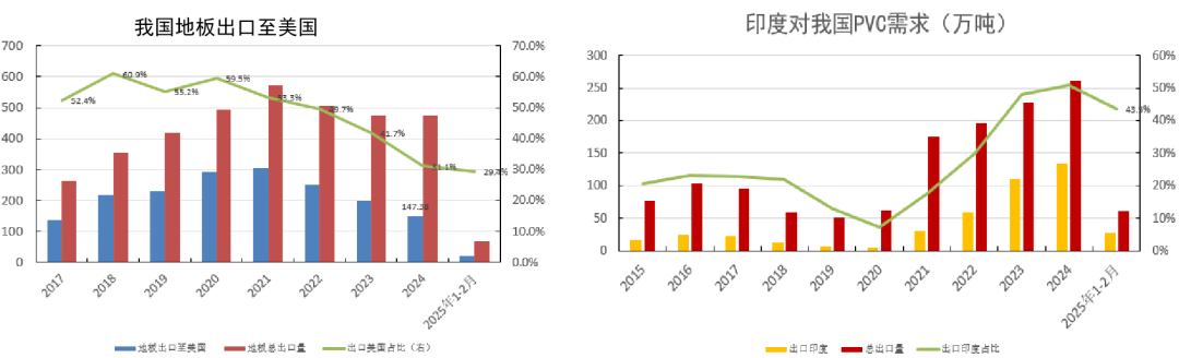 关税政策对PVC地板出口影响更大,2024年出口至美国147万吨的地板,按照0.3折算相当于出口美国44万吨PVC粉。这部分将受到影响。