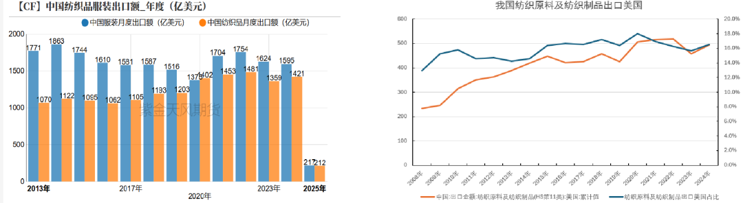 我国为纺织品服装生产及出口大国,2024年纺织品服装出口3011亿美元,同比增2.8%。其中出口美国约494亿元,占比超16%。高关税将增加出口成本,抑制国内出口。