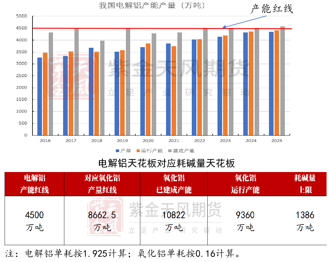 产能红线(不排除放开的可能性)。我国电解铝产能红线为4500万吨,折算成氧化铝产量红线为8662.5万吨,对应耗碱量1386万吨。