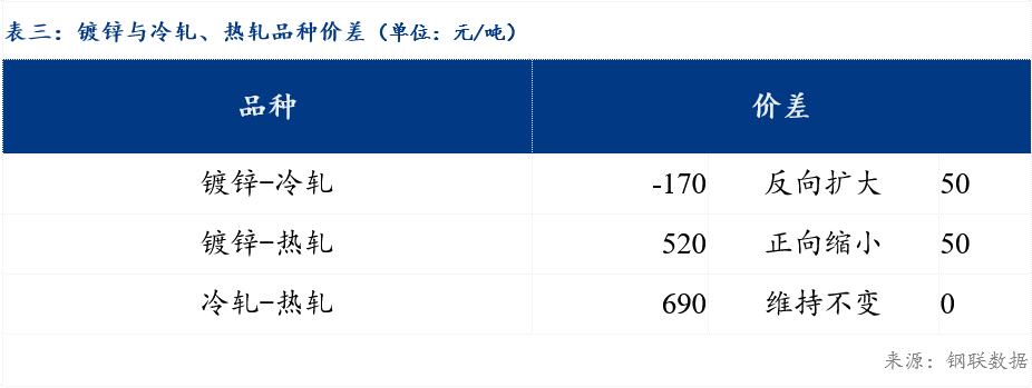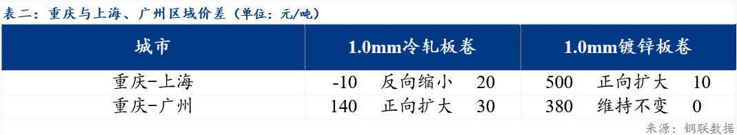 重庆、上海地区冷轧板卷区域价差反向缩小20元/吨,重庆、广州冷轧板卷区域价差扩大30元/吨;重庆、上海镀锌板卷区域价差扩大10元/吨,重庆、广州镀锌板卷区域价差扩维持不变。镀锌、冷轧品种价差反向扩大50元/吨;镀锌、热轧品种价差缩小50元/吨;冷轧、热轧品种价差维持不变。