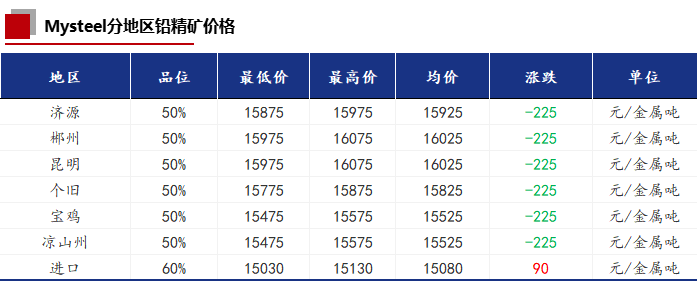 今日受铅价的影响,铅精矿价格下降225元/金属吨。国内铅精矿加工费各地区均未调整,和上一交易日持平。进口铅精矿价格较上一交易日涨90元/金属吨 。