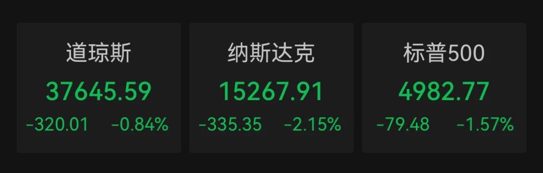 截至收盘,道琼斯指数跌0.84%,一度从高位跌超2300点,报37645.59点;标普500指数跌1.57%,报4982.77点,自去年4月以来首次收于5000点下方;纳斯达克综合指数跌2.15%,报15267.91点。