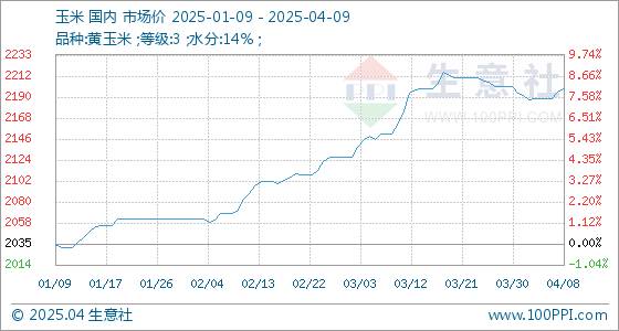 4月9日,生意社玉米基准价为2198.57元/吨,与本月初(2194.29元/吨)相比,上涨了0.20%。
