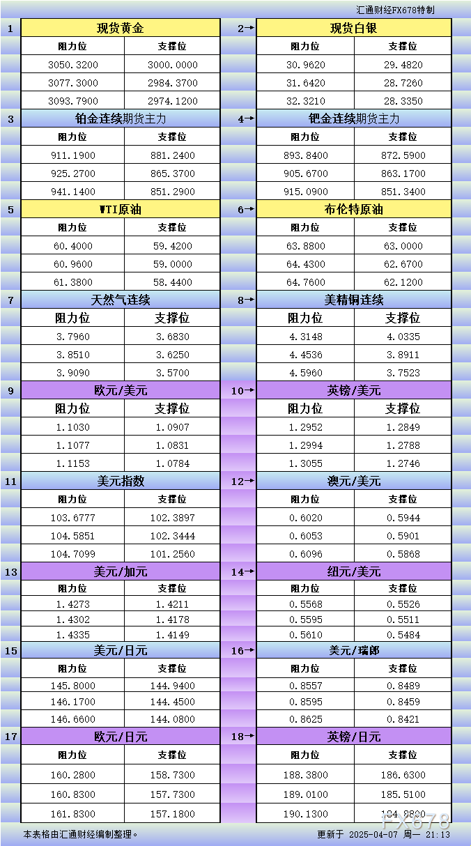 4月7日美市更新支撑阻力:18品种支撑阻力(金银铂钯原油天然气铜及十大货币对)