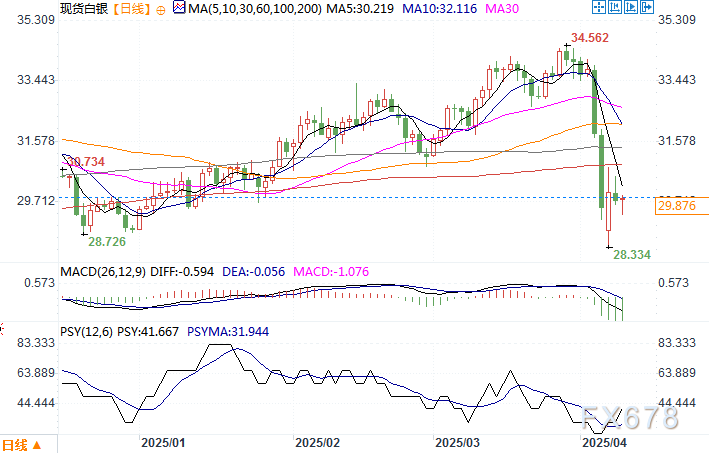 上周,在特朗普宣布关税决定后,银价下跌了13%以上。周一,白银出现进一步的抛售,一度跌至每盎司28.315美元,为去年9月初以来的最低水平。