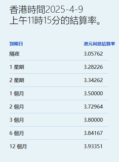 4月9日,港元汇率盘中曾见7.7646兑1美元,为去年12月31日以来最强,最新报7.7650,较前收市价升0.08%。港元拆息则多数偏软,并无大变动。隔夜息今日微跌近3基点至3.05762%,而与楼按相关的一个月拆息中止两连升,报3.5%。反映银行资金成本的三个月拆息维持3.8%,六个月及一年期拆息分别跌至3.84167%和3.93351%。