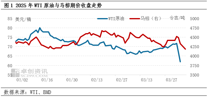 关税导致贸易壁垒扩大对大宗商品需求构成压制。与此同时,欧佩克及其减产同盟国八国宣布逐步取消自愿减产,在宏观风险与基本面压力共同拖拽下,国际油价加速跌势,创三年来单日最大跌幅。截至4月7日,WTI原油期最低跌至58.95美元/桶,较月初(4月1日)收盘跌12.19美元/桶,跌幅17.14%。而原油价格下跌或将削弱生物柴油需求,进而导致植物油在生物燃料领域的消费需求存在减少预期,清明期间马棕期价跟随下跌。7日马棕主力合约期价收至4182令吉/吨,较节前下跌308令吉/吨或6.86%。