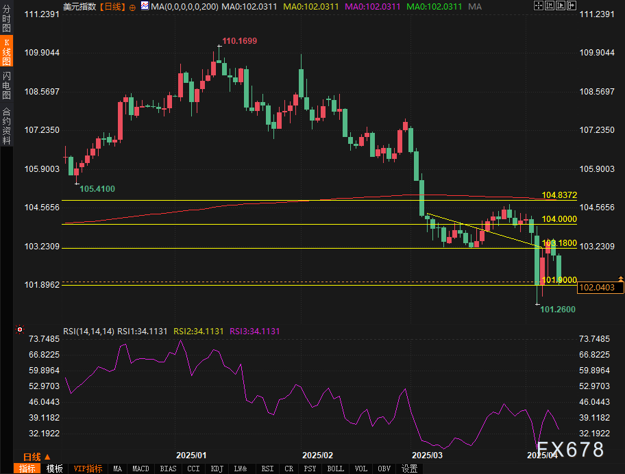 关键支撑测试:美元指数在101.90附近暂获支撑,该位置曾在上周多次遏制跌势。但若关税负面影响持续发酵,下破101.90将打开通往100.00整数关口的空间。