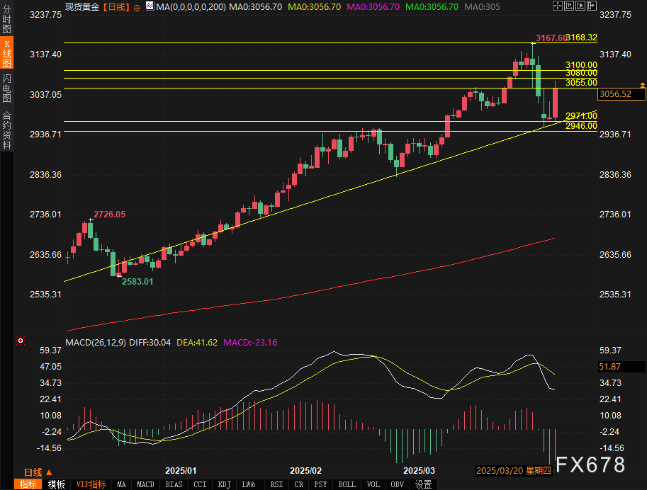 下方防御:3004美元(3月14日高点)与3000美元心理关口构成第一支撑带,失守则可能下探2964美元(S1支撑)及2955美元(周一低吸买盘密集区)。55日均线2935美元为中期强弱分水岭。