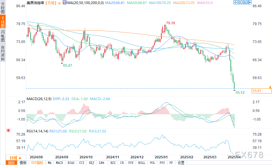 汇通财经APP讯——周三(4月9日),原油价格延续跌势,触及2021年2月以来的最低水平。贸易冲突的升级令全球市场感到不安,引发了对经济增长和能源需求放缓的担忧。