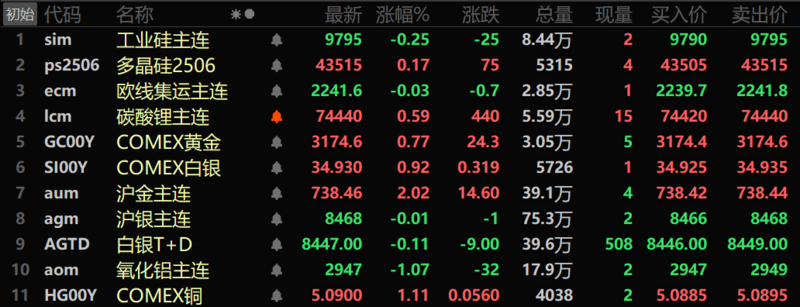此外,氧化铝跌1.07%。碳酸锂涨0.59%,工业硅跌0.25%。多晶硅主力期货涨0.17%。