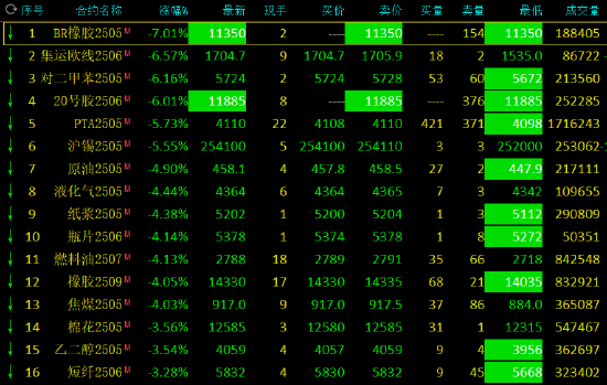 昨日午盘收盘,集运欧线、PX跌超6%,合成橡胶、20号胶跌停,PTA、沪锡跌超5%,SC原油跌近5%,纸浆、液化石油气、橡胶、瓶片、燃油、焦煤跌超4%,乙二醇、棉花、短纤、沥青、焦炭跌超3%。