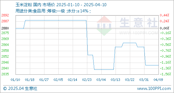 4月10日生意社玉米淀粉基准价为2844.00元/吨