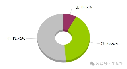 环比下降的商品共86种,集中在化工(共31种)和橡塑(共11种),跌幅在5%以上的商品主要集中在化工板块;跌幅前3的商品分别为二甘醇(-5.57%)、涤纶FDY(-5.03%)、丁苯橡胶(-4.99%)。