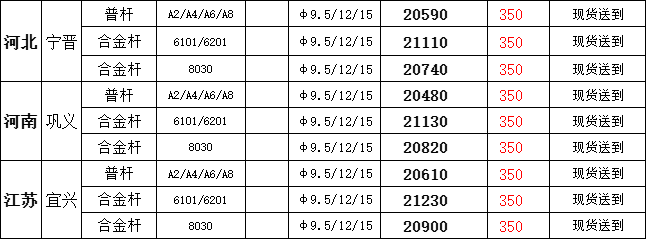 4月10日宁晋市场普铝杆现货报盘价20590元/吨,较上一交易日报价涨350元/吨;巩义市场普铝杆现货报盘价20480元/吨,较上一交易日报价涨350元/吨;宜兴市场普铝杆报盘价20610元/吨,较上一交易日报价涨350元/吨。