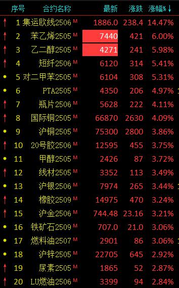 国内商品期货多数上涨,苯乙烯、乙二醇主力合约涨停,集运指数(欧线)涨超14%,短纤、PX涨逾5%,甲醇、NR等涨超3%,尿素、原油等涨超2%,纯碱、棉纱等涨超1%,硅铁、生猪等小幅上涨;菜粕跌超2%,豆粕、豆一等跌逾1%,玻璃、焦煤等小幅下跌。