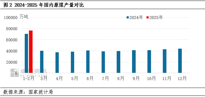 据国家统计局数据,2025年1-2月份全国原煤产量7.7亿吨,同比增7.7%,增速比上年12月份加快3.5个百分点;日均产量1297万吨。全国原煤产量整体保持在高位水平,实现同比宽幅增长,供应充裕,且春节后煤矿复产进程较快,致使2月煤价出现大幅度下跌,2月榆林地区Q6000大卡动力煤主流市场价格均价环比1月跌幅达到9.6%。但进入3月后,前半段受国内重要会议影响,煤矿生产多保安全意识较浓,生产谨慎,部分民营煤矿主动开展设备检修或搬家倒面工作,产地供应存在阶段性收紧现象,形成煤价跌后反弹的基础。