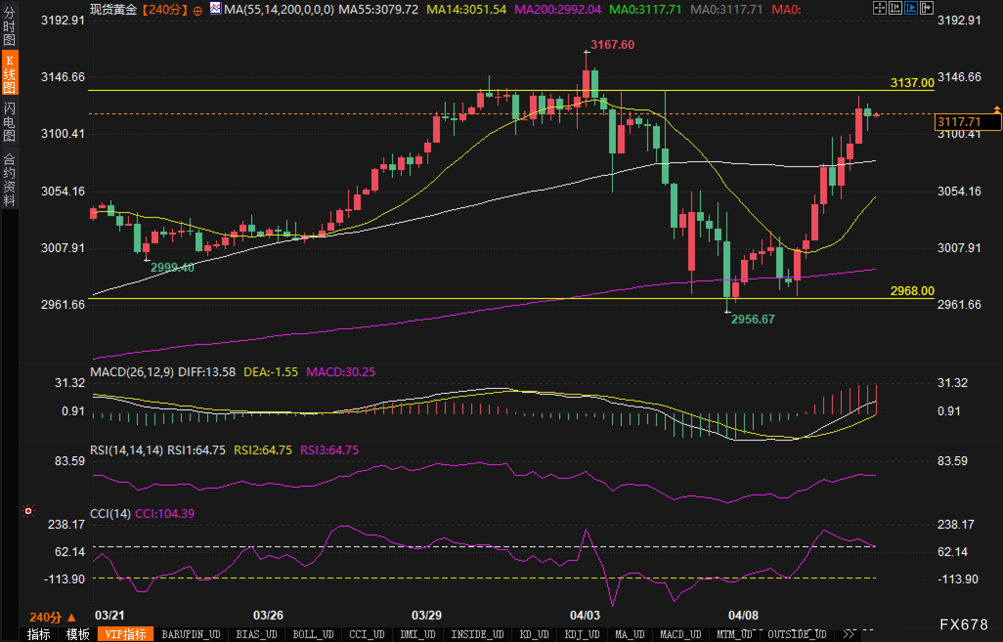 从4小时图来看,现货黄金已完成一个典型的V型反转形态,经历深度回调后强势反弹。金价在触及2956.67美元的低点后展开反攻,一举突破多条移动平均线的压制,并最终站稳3100美元关键阻力位。值得注意的是,金价目前运行在上升趋势线之上,这表明短期趋势已明确转为看涨。