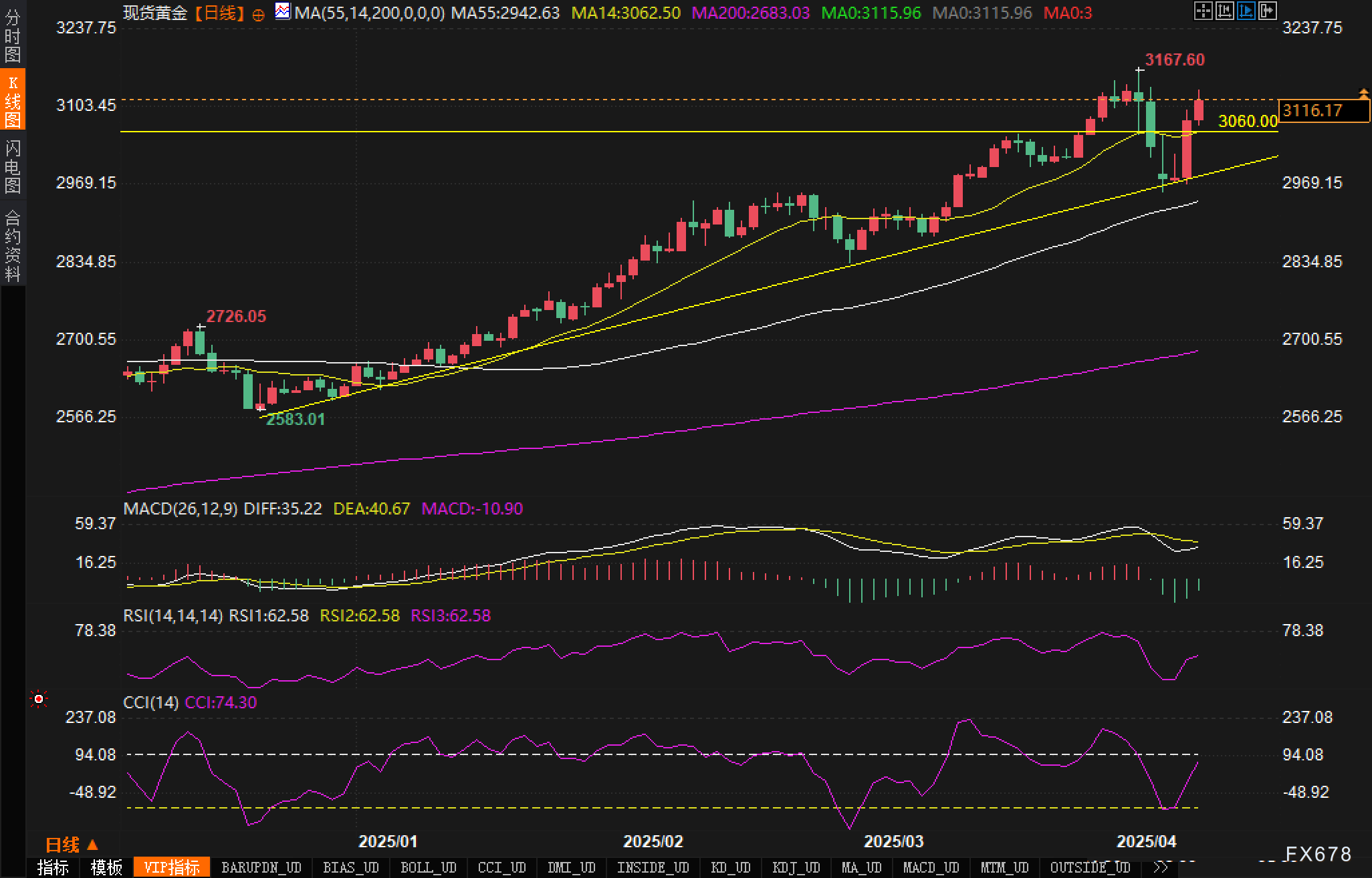 短期展望:金价突破3100美元关键阻力后,技术面呈现明显转强态势。若能站稳此位,下一目标将指向历史高点3167.60美元,突破后将开启新一轮上涨空间。支撑方面,3060.00美元(前期突破位)将提供有效支撑,若失守则可能回调至上升通道下轨2968.00美元附近。近期美国通胀数据及贸易局势发展将成为短期走势的关键催化剂。