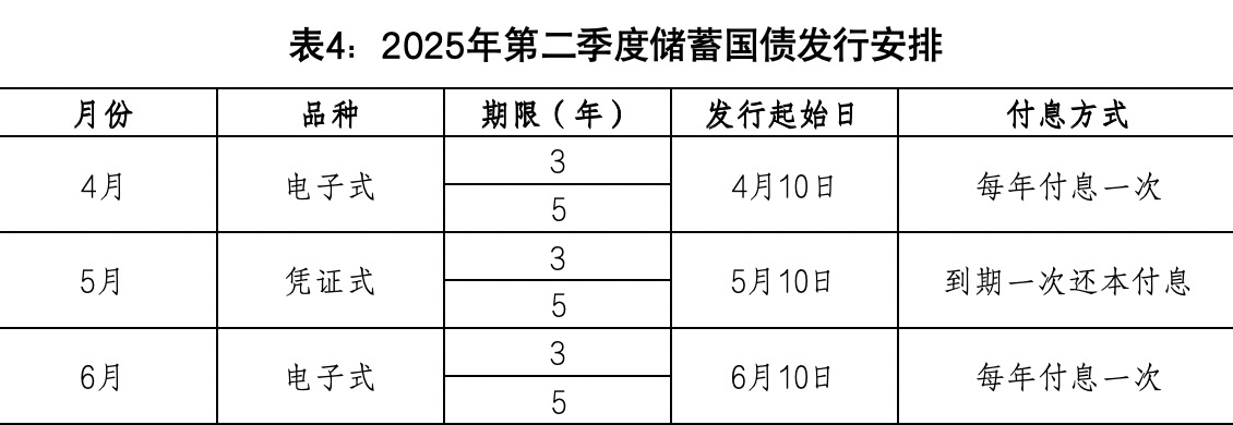本次发行结束后,根据后续相关安排,财政部将于5月10日、6月10日分别再度发行凭证式储蓄国债、电子式储蓄国债。