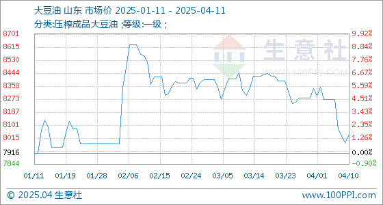4月11日,生意社大豆油基准价为8042.00元/吨,与本月初(8342.00元/吨)相比,下降了-3.60%。