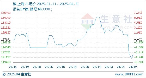 4月11日,生意社镍基准价为122308.33元/吨,与本月初(130633.33元/吨)相比,下降了-6.37%。