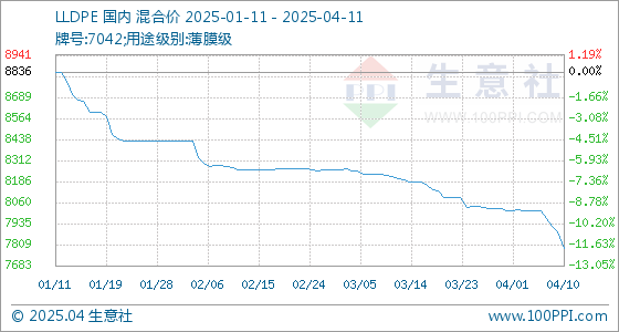 4月11日,生意社LLDPE基准价为7788.33元/吨,与本月初(8011.67元/吨)相比,下降了-2.79%。