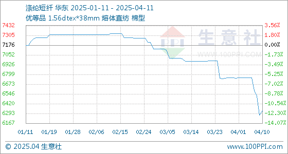 4月11日,生意社涤纶短纤基准价为6326.88元/吨,与本月初(6749.00元/吨)相比,下降了-6.25%。