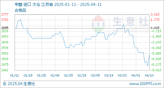 4月11日,生意社甲醇基准价为2537.50元/吨,与本月初(2590.00元/吨)相比,下降了-2.03%。