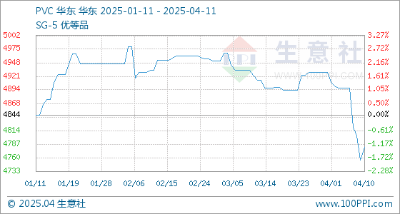 4月11日,生意社PVC基准价为4781.00元/吨,与本月初(4930.00元/吨)相比,下降了-3.02%。