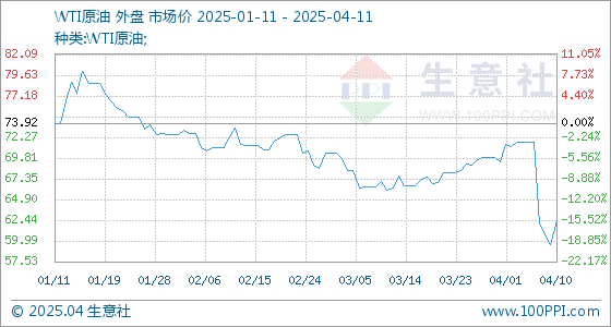 4月11日,生意社WTI原油基准价为62.35美元/桶,与本月初(69.36美元/桶)相比,下降了-10.11%。
