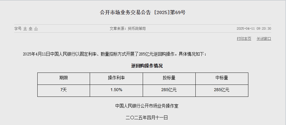 人民银行4月11日公告称,2025年4月11日中国人民银行以固定利率、数量招标方式开展了285亿元逆回购操作,操作利率为1.50%,与此前持平。因今日无逆回购到期,实现净投放285亿元。