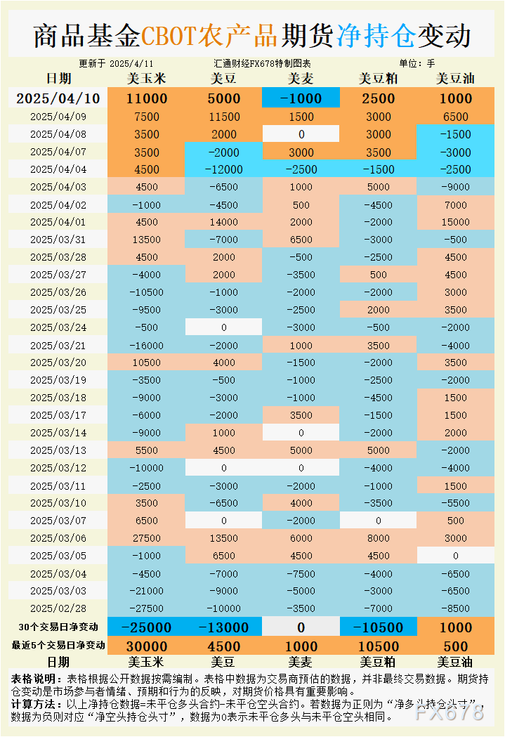 汇通财经APP讯——周五(4月11日),芝加哥期货交易所(CBOT)谷物期货市场呈现分化走势,市场情绪在基本面数据、持仓变动以及国际交易动态的交织下显得复杂多变。美国农业部(USDA)最新供需报告下调玉米和大豆库存预期,提振了玉米和大豆期货价格,而小麦因库存上调承压下行。豆油和豆粕则在出口需求与供应节奏的博弈中波动。持仓数据反映出资金对玉米、大豆和豆粕的看多情绪升温,但对小麦的看空态度加剧,豆油则维持谨慎乐观。结合基差动态和国际市场消息,本文将深入分析各品种的持仓变动、市场情绪及其对未来走势的指引。