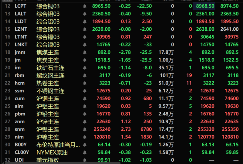 截至午间收盘,内盘基本金属全线上涨,沪铜涨0.92%。沪锡涨2.73%,沪镍涨1.54%。沪铝微涨,沪铅涨0.81%,沪锌涨1.12%。