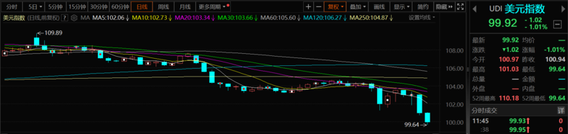 截至11:45分,美元指数跌1.02%,报99.91,盘中最低跌至99.64。由于汽油和二手机动车价格降低,3月份美国消费者物价意外下降,但温和的通胀读数不太可能持续,美元全线走弱,美元指数跌破100大关,为2023年7月以来首次。关税政策的不确定性引发了市场对全球和美国的经济衰退风险的担忧加剧。市场开始押注美联储将于6月重启降息周期。据CME FedWatch工具数据显示,市场目前预计美联储5月6-7日会议上降息的概率已从一周前的14%飙升至44%。全球投资者将对美国政策前景、经济健康度及美元信用体系进行再评估。