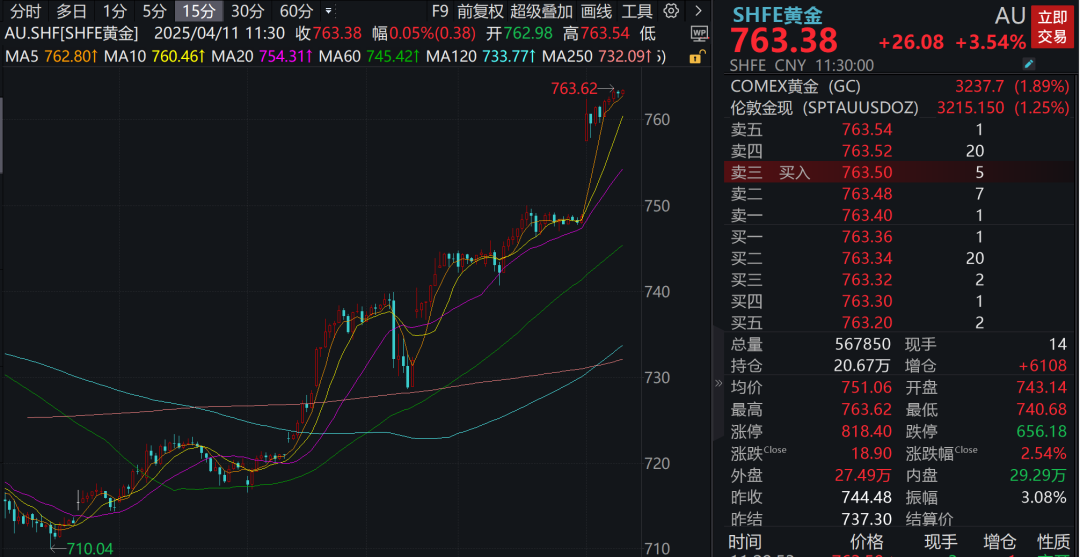 国内期货市场上,在此前于4月7日短暂回调至701元/克后,沪金主力合约2506近日也连续反弹,4月11日中午收盘涨至763.38元/克。