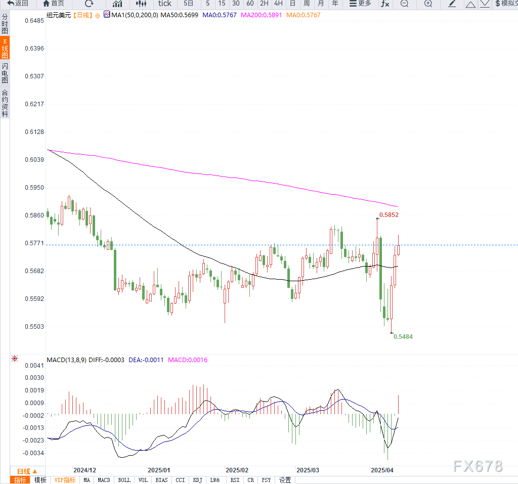 技术面看,NZD/USD若突破0.5800,下一目标位将指向0.5850一线。短期支撑位在0.5730,若跌破该位,则上涨趋势可能中断。