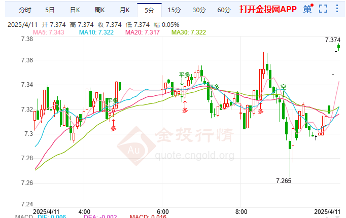 今日周五(4月11日)亚盘时段,纸白银目前交投于7.374一线上方,今日开盘于7.244元/克,截至发稿,纸白银暂报7.373元/克,上涨1.91%,最高触及7.374元/克,最低下探7.208元/克,目前来看,纸白银盘内短线偏向看涨走势。