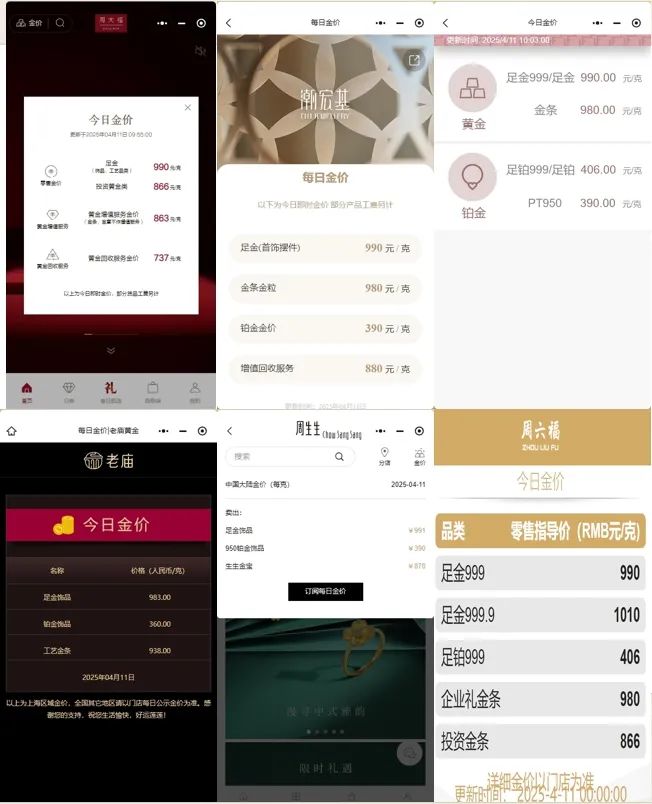 具体而言,当日上午,周生生足金首饰境内价格为991元/克,较前一日一克上涨32元,较3月31日一克上涨56元;周大福足金(首饰、摆件类)、六福珠宝足金999/足金、潮宏基足金(首饰摆件)、周六福足金饰品境内价格为990元/克;老庙黄金上海区域足金饰品价格为983元/克。