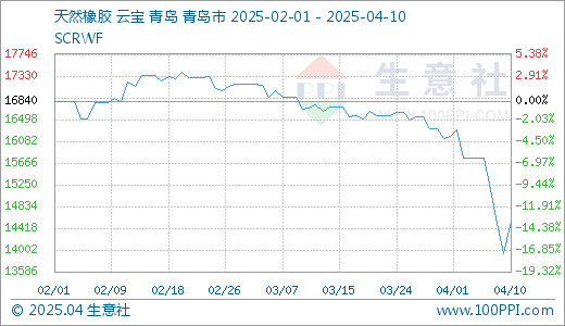 据生意社商品行情分析系统,近日(4.1-4.10)国内天然橡胶现货行情大幅下行,截至4月10日我国天然橡胶市场现货胶行情在14598元/吨左右,较1日的16172元/吨下跌9.73%。当前受国际贸易消息影响,国内橡胶市场气氛偏弱。原料价格高位回落;国内天胶港库库存延续增加;下游开工小幅走低;沪胶行情大幅下行,带动天然橡胶现货行情大幅调整。