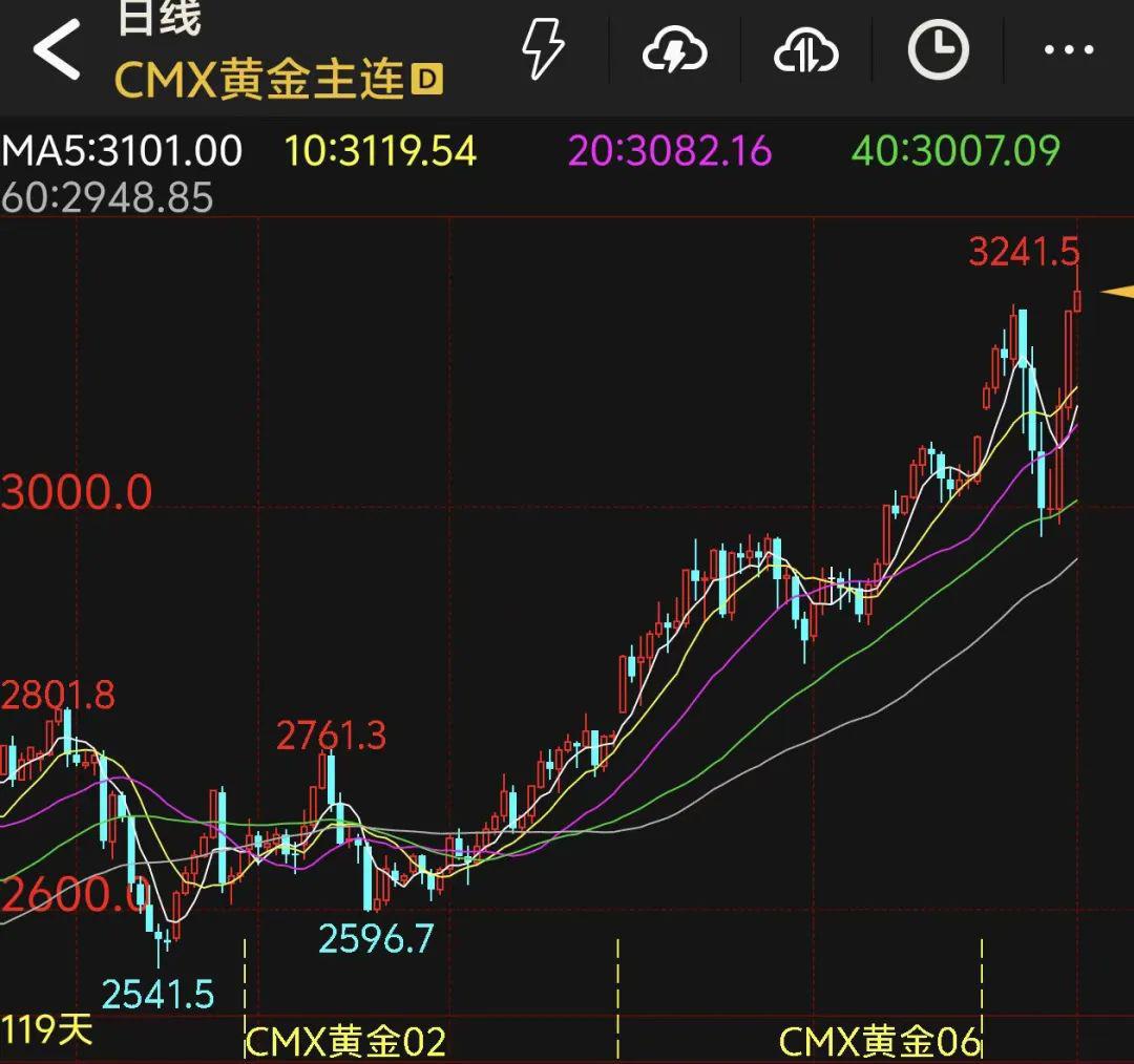 4月11日盘中,COMEX黄金期货主力合约升至3241.5美元/盎司,创历史新高。沪金主力合约盘中最高触及763.62元/克,创历史新高,下午收盘报757.30元/克,涨幅2.71%。有分析称,美国企业仍面临“供应链地震”风险,美国今年经济增长或遭遇“滑铁卢”,黄金避险需求上升。