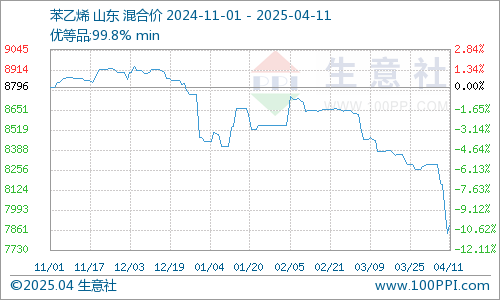 据生意社商品分析系统,本周苯乙烯市场继续下跌,周初均价8170元/吨,周末均价7890元/吨,周内跌3.43%。