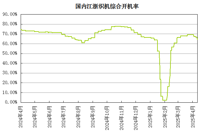 下游市场表现谨慎,在成本坍塌之下,市场成交清淡,对原料备货积极性不高,多刚需购入随采随用。终端织造行业,尤其是外贸订单方面,询单基本停滞,市场多处观望状态,实单下达零星,内外贸短期无明显利好提振,江浙织机开工率小幅下滑至65%以下。